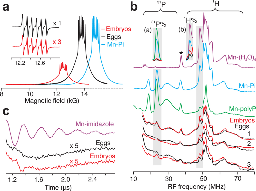31P/1H Davies pulsed-ENDOR spectra of: intact frog eggs and embryos; solution Mn2+ complexes (aquo [H2O], orthophosphate [Pi], polyphosphate [polyP]). Braces represent frequency ranges of 31P and 1H ENDOR signals. ENDOR spectra are normalized to Mn2+ concentration; thus 31P%, 1H% peaks (gray highlight) represent absolute ENDOR responses. Insets: (a) 31P% ENDOR responses of exemplars and eggs/embryos from frog 3; (b) corresponding 1H% ENDOR responses. (* is a 55Mn ENDOR signal) c.