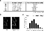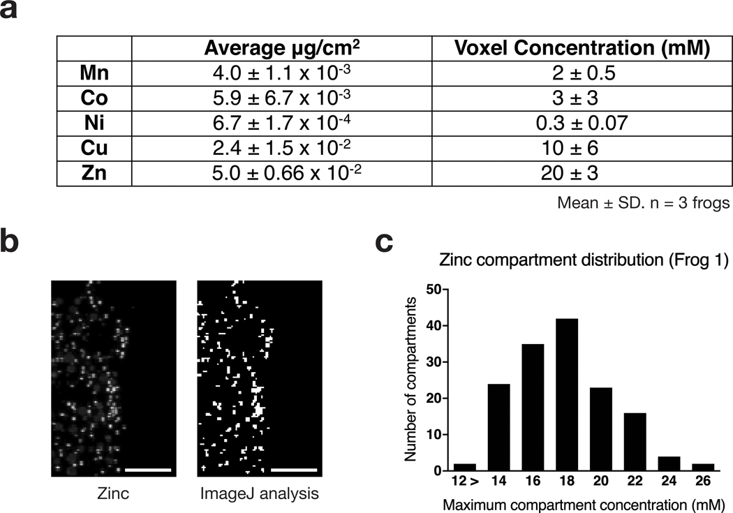 Figure 5:. Animal pole egg metal compartment contents.Metals are stored at millimolar concentrations in the cortical compartments. a. Concentrations of metal compartments in the egg animal pole. Voxel size 300 à 300 à 400 nm. Data acquired at Beamline 2-ID-D, Argonne National Laboratory. Values reported as mean ± SD, n = 3 slices of eggs analyzed from separate frogs examined over 2 independent experiments. b. Representative image of zinc distribution and thresholding of areas of high zinc concentration. Scale bar = 10 μm. Images acquired at Beamline 2-ID-D at Argonne National Laboratory. Pixel size: 300 à 300 nm, slice thickness: 400 nm, scan time: 500 ms/pixel. c. Representative plot of the zinc concentration distribution of small metal compartments found in a slice. n = 156 compartments.