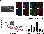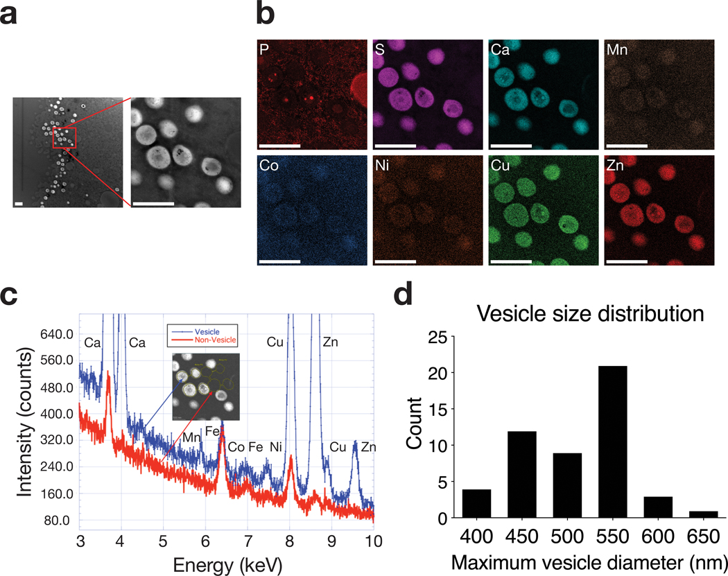 Figure 6:. Analytical electron microscopic analysis of egg animal pole cortical vesicles.AEM demonstrates that multiple metals are stored in sub-micrometer vesicles in the animal pole. a. High Angle Annular Dark Field Scanning Transmission Electron Microscopy (HAADF-STEM) images of the cortex of the animal pole of a fixed Xenopus egg. b. Hyperspectral elemental intensity distribution maps: background corrected, with a 0.7-pixel gaussian blur, no normalization, no quantification. Same conditions as in a. Scale bar = 1 μm in both a. and b. These are representative images of 3 separate scans. c. Cumulative XEDS spectra confirming the presence of Ca, Mn, Co, Ni, Cu, and Zn in vesicles. These comparison spectra are obtained by summing individual spectra from an identical number of pixels in regions of interest which correspond to vesicle and neighboring non-vesicle areas. d. Histogram of vesicle diameter distribution from image in a. n = 50 vesicles measured.