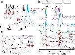 14N 3-pulse ESEEM timewaves of: eggs (black); embryos (red), each multiplied by 5 for ease of comparison; solution Mn-imidazole complex (purple). Experimental conditions: see Supplemental Methods (b, c, Fields ~ 12.5k G). In a., b., and c. n = 3 biologically independent replicates of intact frog eggs and embryos examined over 3 independent experiments.