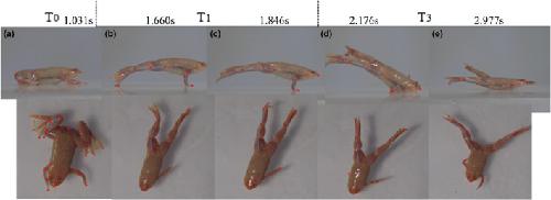FIGURE 4. Frame sequences of a X.lavis's jump. T0‐Preparation phase; T1‐Takeoff phase; T3‐Landing phase; a is the head‐up moment in preparation; b is the moment hindlimbs is about to leave; c is the moment hindlimbs just takeoff from the ground; d is the moment the body hits the ground; e is the moment whole body land on ground, and all limbs are about to rotate to recover preparation posture