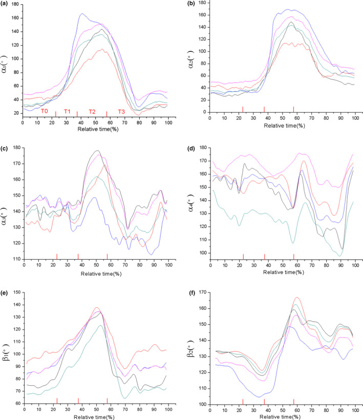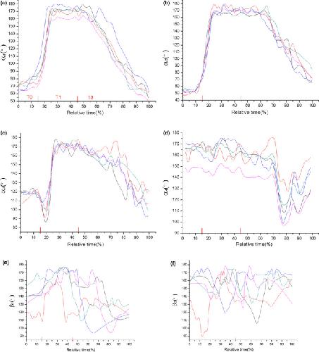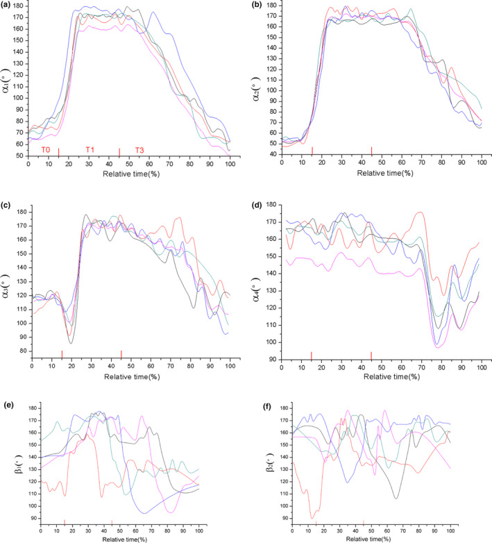 FIGURE 3. Angle motion profiles of the R. dybowskii ' joints during jumping, (a‐f) is the angle of knee, ankle, TMT, midfoot, elbow, and wrist, respectively