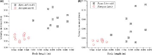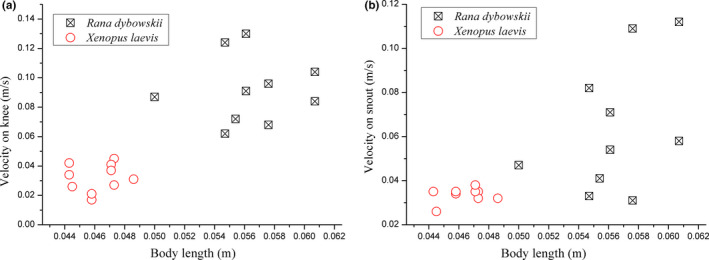 FIGURE 6. Differences on takeoff velocity of Rana dybowskii and Xenopus laevis (a) velocity on knee, V5 (b) velocity on snout, Vs