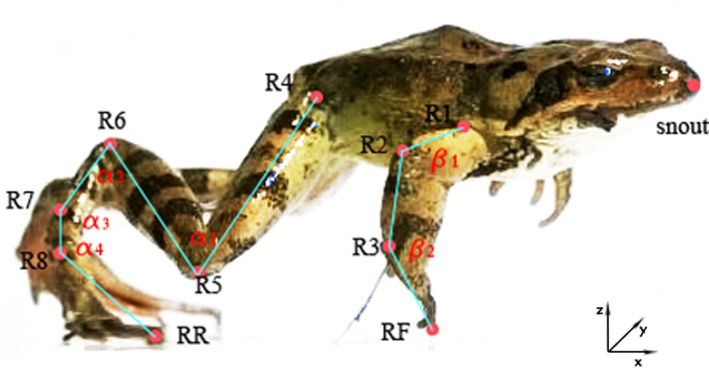 FIGURE 1. Schematic view of a frog's jump. R1âshoulder; R2âelbow; R3âwrist; RFâfore toe; R4âhip; R5âknee; R6âankle; R7âTMT; R8âmidfoot; RRârear toe; a