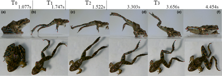 FIGURE 2. Frame sequences of a R. dybowskii's jump. T0‐Preparation phase; T1‐Takeoff phase; T2‐Flight phase; T3‐Landing phase; a is the head‐up moment in preparation; b is the moment hindlimbs just leave the ground; c is the initial time of flight; d is the moment forelimbs hit the ground; e is the moment the body hits the ground; f is the moment all limbs land on ground