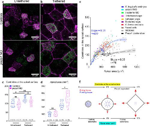 Figure 6. Piezo1 dysfunction leads to reduced number of centrioles in MCCs in a tension-dependent manner.MCCs marked with chibby-GFP (centrioles, green), and phalloidin (F-actin, magenta) in controls and piezo1 morphants in (a) untethered animal caps and (b) tethered animal caps. Quantitation of (c) number of centrioles at the apical surface and (d) apical area in untethered animal caps and tethered animal caps. * indicates statistical significance at p < 0.05. The statistical comparison between the treatments is done using a one-way ANOVA followed by Tukeyâs multiple comparison test. n = number of cells collected from six to eight animal caps obtained from two independent experiments. (e) Regression plot showing a positive scaling relationship between apical area and the number of centrioles at the apical surface across all the treatments performed in this paper. When Piezo1 function is affected (black: piezo1 MO, piezo1 CRISPR, and GSMTx-4), the scaling relationship is abolished. n = number of cells. (f) Model illustrating that pushing forces dominate in the initial phase of apical expansion (apical area increases from 0 to ~150 μm2) and the centriole number reaches ~100. In the later phase of apical expansion, pulling forces dominate which changes the cell shape from round to polygonal. The pulling force is sensed by Piezo1 to regulate the amplification of the next ~50 centrioles. The data is uploaded as source data 6. Figure 6âsource data 1. Source data related to Figure 6. |
