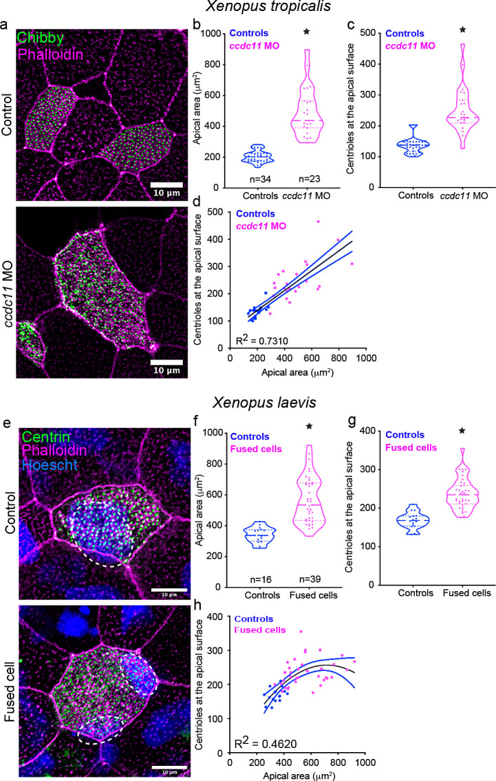 Figure 1âfigure supplement 2. Increasing apical area leads to an increase in centriole number.(a) Mature (Step 4) epidermal MCCs marked with chibby-GFP (centrioles, green) and phalloidin (F-actin, magenta) in control and ccdc11 morphant embryos at Stage 28. Quantitation of (b) apical area and (c) centriole number in MCCs of control and ccdc11 morphant embryos. (d) Regression plot showing the positive correlation between apical area and centriole number. (e) Control and epidermal MCC fused with a neighboring cell marked with chibby (centrioles, green) and phalloidin (F-actin, magenta). Dashed circles indicate nuclei (Hoescht). Quantitation of (f) apical area and (g) centriole number in MCCs of control and fused MCCs. (h) Regression plot showing the positive correlation between apical area and centriole number. * indicates statistical significance at p < 0.05. The statistical comparison between the treatments (b, c, f, g) is done using an unpaired t test. R2 is the correlation coefficient. n = number of cells collected from 6 to 20 embryos. The data is uploaded as source data 1. |