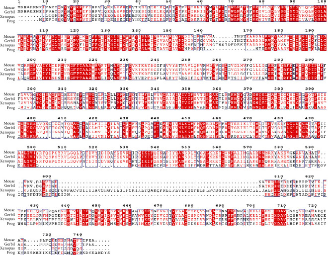 Figure 1. Alignment of amino acid sequences of SLC26A5 of mouse, gerbil, Xenopus, and bullfrog. Different colors had been used to represent identity of each residue among four species. Red block: full identity at a residue; red letter: partial identity at a residue; black: complete disparity at a residue. Gaps in the aligned sequences were indicated by the dashed line.