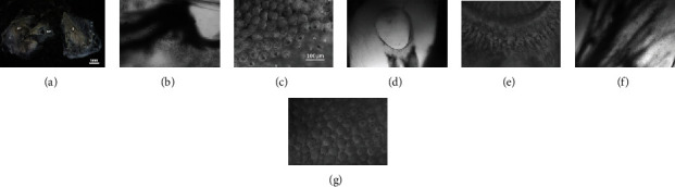 Figure 4. Images of frog's hearing organ. (a) Dissection of the frog's inner ear which contained three auditory organs (AP, BP, and S) under a 10x microscope. (b, c) Displayed was a higher magnification image of the AP under a 100x and 600x microscope. (d, e) Displayed was a higher magnification image of the BP under a 100x and 600x microscope. (f, g) Displayed was a higher magnification image of the S under a 100x and 600x microscope.