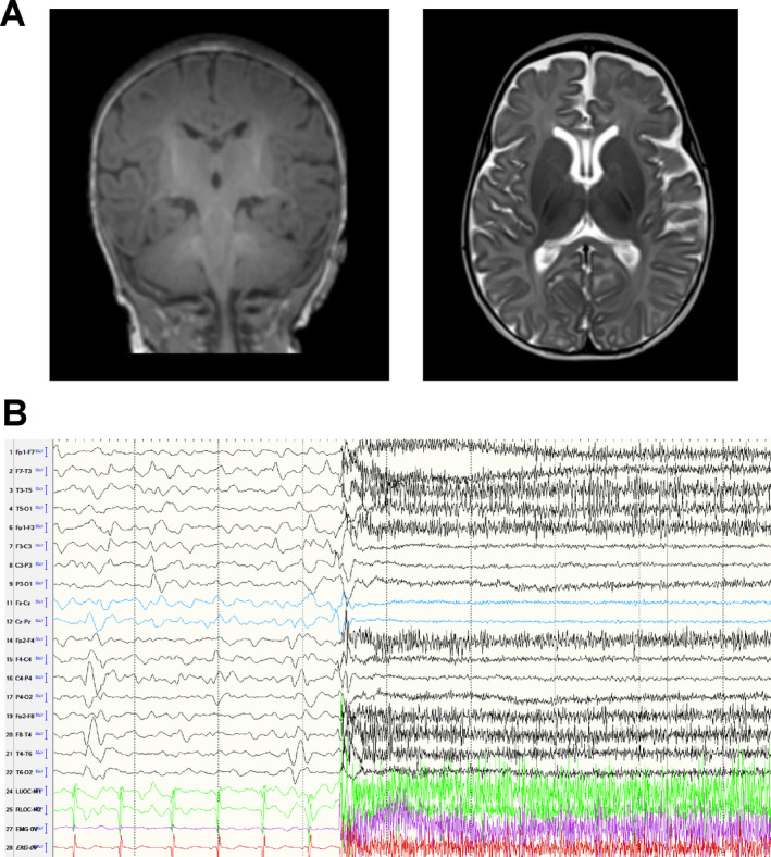 Brain MRI and EEG features of the patient with the M641I variant. (A) MRI of the brain at 3âmonths of age was normal. (B) Ictal EEG at 9âmonths of age showed electro decrement superimposed with fast activity and myogenic artifacts in a patient with typical epileptic spasms.
