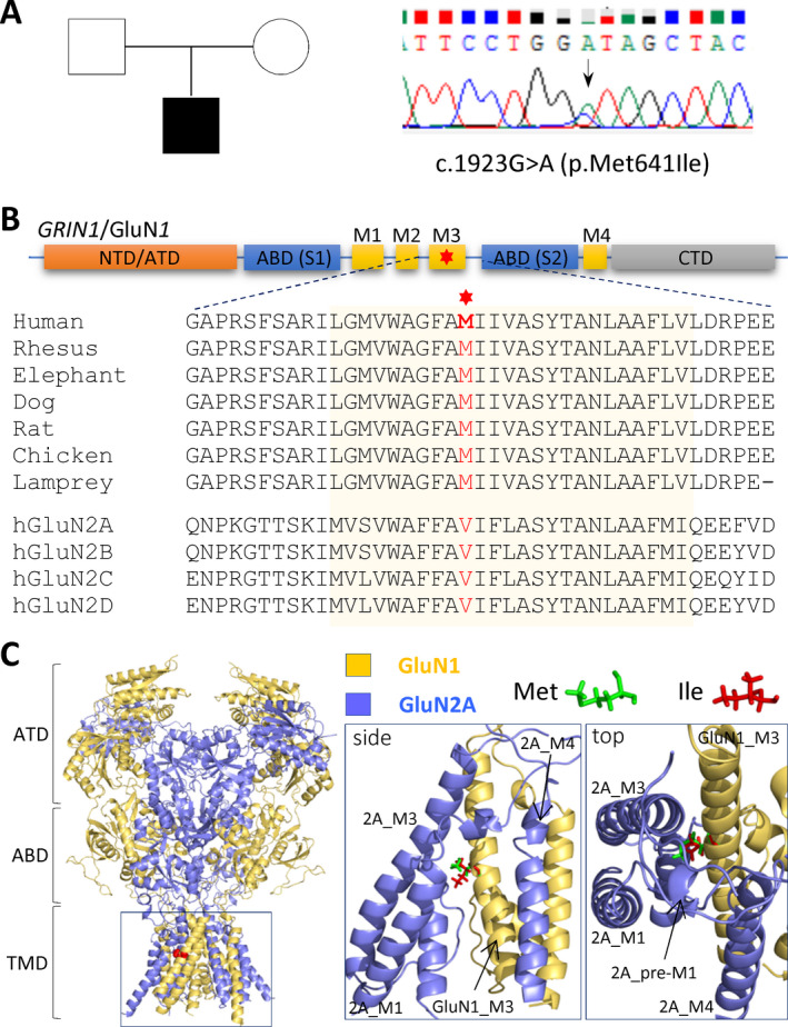 De novo GRIN1 c.1923G>A (GluN1 p.Met641Ile) variant. (A) A de novo GRIN1 missense variant (c.1923G>A, p.Met641Ile) was identified in a male patient using the nextâgeneration wholeâexome sequencing. (B) A linear schematic representation of the GluN1 subunit (the position of M641 is marked with red). The Methionine residue at position 641 is highly conserved across most of the subphylum Vertebrata. (C) A homology model of GluN1/GluN2A subunit built from the GluN1/GluN2B crystallographic data. 34 , 35 The GluN1âM641I residue resides in the M3 transmembrane helix. The substitution of an amino acid (methionine to isoleucine) is shown as a stick model and marked with a different color.