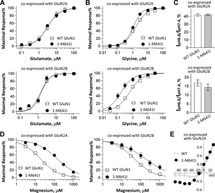 FIGURE 3. GluN1M641I alters NMDAR pharmacological properties. (A and B) Composite concentrationresponse curves for glutamate (A, in the presence of 100mol/L glycine) and glycine (B, in the presence of 100mol/L glutamate) recorded at a holding potential of 40mV for WT GluN1 and GluN1M641I coexpressed with GluN2A (upper panels) or GluN2B (lower panels), respectively. (C) Summary of proton sensitivity evaluated by current ratio at pH 6.8 to pH 7.6 (in the presence of 100mol/L glutamate and 100mol/L glycine) at a holding potential of 40mV of the WT GluN1 and GluN1M641I when coexpressed with GluN2A (upper panel) and GluN2B (lower panel), respectively. (D) Composite concentrationresponse curves for Mg2+ in the presence of 100mol/L glutamate and 100mol/L glycine at a holding potential of 60mV of the WT GluN1 and GluN1M641I when coexpressed with GluN2A (left panel) and GluN2B (right panel), respectively. (E) Mg2+ currentvoltage (IV) curves for the WT GluN1 and GluN1M641I coexpressed with GluN2A. All current responses were normalized to the current recorded at +30mV. Composite data are shown as meanSEM. NMDAR, NmethylDaspartate receptor; WT, wildtype.