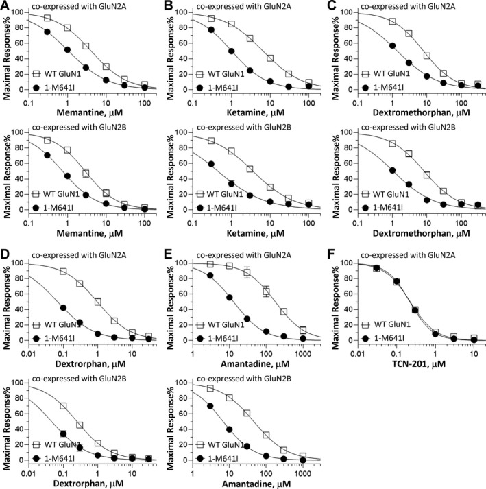 FIGURE 5. The effect of NMDAR antagonists, including FDAapproved drugs, on the WT and GluN1M641I NMDARs. Composite concentrationresponse curves of NMDAR antagonists were evaluated by TEVC recordings of Xenopus oocytes in the presence of 100mol/L glutamate and 100mol/L glycine (except for TCN201 with 3mol/L glycine) at a holding potential of 40mV. Curves are shown for (A) memantine, (B) ketamine, (C) dextromethorphan, (D) memantine, (E) amantadine, and (F) TCN201. Data are shown as mean SEM; SEM is shown when larger than symbol size. NMDAR, NmethylDaspartate receptor; TEVC, twoelectrode voltageclamp; WT, wildtype.