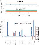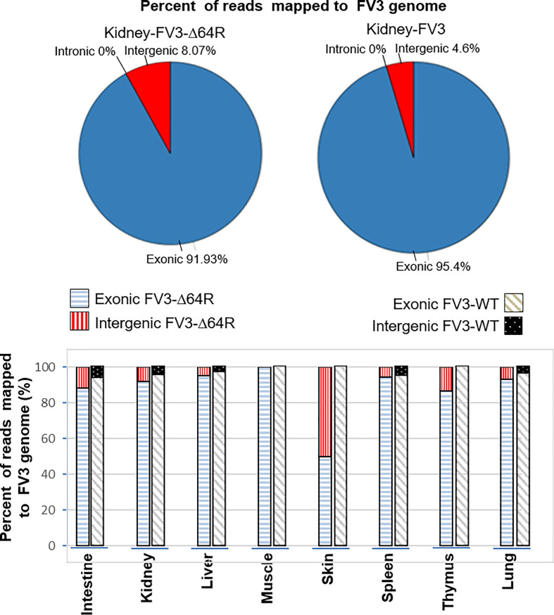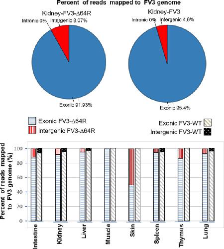 Figure 1. Percent of reads mapped to functionally different regions on FV3 genome. The FV3 genome regions are functionally classified as exons, introns, or intergenic regions based on annotation of the reference genome (NC_005946.1). As intronic regions (introns) are lacking in ranaviral coding genes, about 50 intergenic regions are interspersed between ORFs. The intergenic regions take about 20% of the FV3 genome with a length of 20-900 bp. Transcriptomic reads in most infected tissues are also remarkably mapped within these intergenic regions, indicating that these intergenic regions are transcribed and probably function as regulatory RNA species.