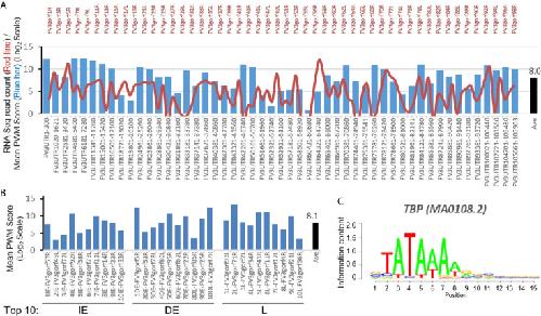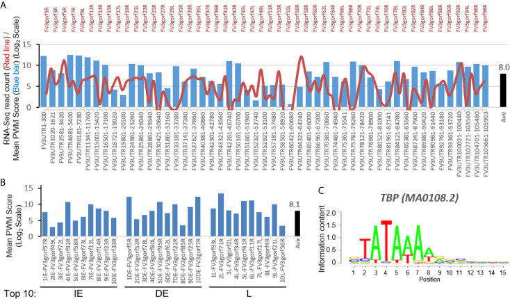 Figure 2. Transcriptomic comparison and distribution of TATA-Box-like cis-element in intergenic regions of the FV3 genome. (A) Line chart depicts cross-tissue averages of RNA-Seq reads differentially mapped to intergenic regions and almost all annotated FV3 coding ORFs labeled on the top. Note the X-Axis tick labels on the top for even-numbered ORFs (such as FV3gorf2L between FV3gorf1R and FV3gorf3R) are omitted due to the space limitation. Bar chart depicts the position weight matrix (PWM) scores of the TATA-box, a cis-regulatory element (CRE) marking core promoters of eukaryotic genes significantly detected across all FV3-genome intergenic regions (labeled as FV3UTR start-end nt position along the FV3 reference genome). (B) Mean PWM scores of TATA-box CRE in FV3 intergenic regions that are intermediately upstream of top-ten highly expressed FV3 coding genes (ORFs) in each temporal class of immediate early (IE), delay early (DE), or late (L) genes as revealed by transcriptomic analyses. Mean PWM scores were calculated using tools at https://ccg.epfl.ch/pwmtools/pwmscore.php. In both (A) and (B), the cross-panel mPWM scores of the TATA-box CRE is averagely (Ave) shown as data-labeled black bar at the right. (C) The matrix of TATA-box that interacts with a transcription factor of TATA-box binding protein (TBP) is from MEME-derived JASPAR CORE 2020 vertebrates affiliated with the PWM tools.