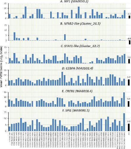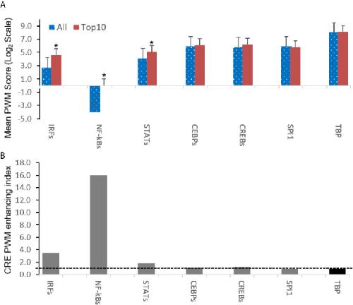 ) are from MEME-derived JASPAR CORE 2020 vertebrates or JASPAR CORE 2018 vertebrates clustering affiliated with the PWM tools. The genome-wide mPWM scores across all intergenic regions for each CRE are averagely shown (Ave) as data-labeled black bars at the right for overall comparison. CEBP, CCAAT enhancer binding protein beta; CREB, cAMP-response element binding protein; IRF, interferon regulatory factor; NF-κB, Nuclear factor-κB; SPI1 or PU.1, a TF binding PU-box, a purine-rich DNA sequence; and STAT, signal transducer and activator of transcription.