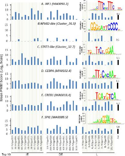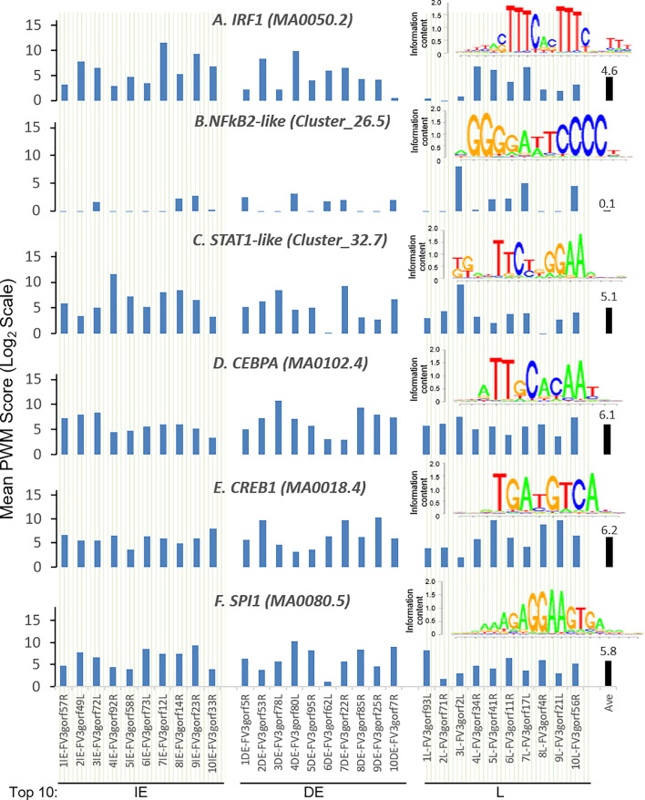 Figure 4. Intergenic regions immediately upstream of highly expressed FV3 genes serve as putative core promoters with enhanced capacity to bind vertebrate transcription factors of (A) IRFs, (B) NF-κB2-like, and (C) STAT1-like, but not much enhanced for (D) CEBPA, (E) CREB1, and (F) SPI1 transcription factors. Shown are mean PWM scores of cis-regulatory elements (CREs) in FV3 intergenic regions that are immediately upstream of top-ten highly expressed FV3 coding genes (ORFs) in each temporal class of immediate early (IE), delay early (DE), or late (L) genes. Mean PWM scores were calculated using tools at https://ccg.epfl.ch/pwmtools/pwmscore.php with CRE Matrices are from MEME-derived JASPAR CORE 2020 vertebrates or JASPAR CORE 2018 vertebrates clustering affiliated with the PWM tools. The cross-panel average mPWM scores (Ave) of each CRE are shown as data-labeled black bars at the right for overall comparison. Abbreviations of TFs are as in