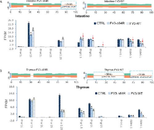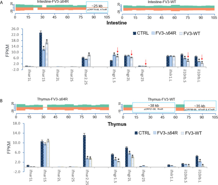 Figure 8. Transcriptomic comparison of the viral genome and X. laevis mRNA encoding interferon receptor subunits in the mock, FV3-Δ64R, and FV3-WT infected intestine (A) and thymus (B). The distribution plots of mapped reads alone FV3 genome (GenBank Accession No. NC_005946.1) were shown as in