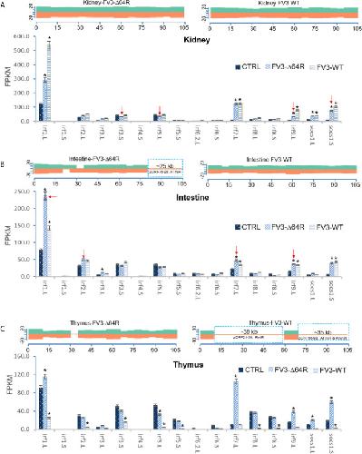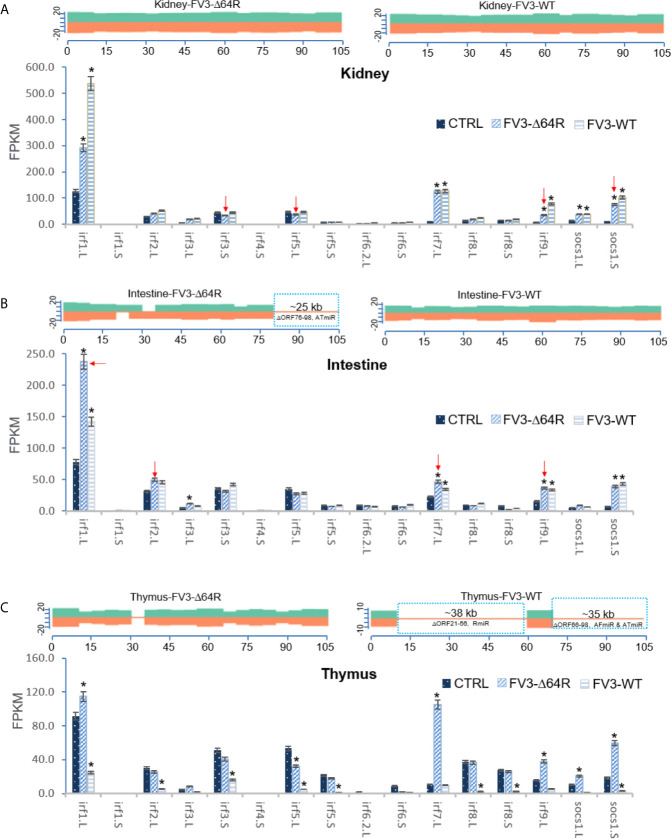 with a full-genome coverage for the infected kidney samples. Partial coverages of the viral genome were determined in the FV3-Δ64R infected intestine and for both FV3-WT and FV3-Δ64R in the infected thymus. Comparative alignments indicates that transcripts of some ORFs and miRNA-enriched intergenic regions are defective (labeled and framed using blue line) as compared between two virus strains. Analysis shows reduced expression of IRF genes corresponding to potential higher expression of respective miRNA by FV3-Δ64R in kidney and FV3-WT in intestine (indicated by red arrows). However, miRNA-mediated reduction of IRF genes is not detected in FV3-Δ64R infected thymus. This suggests a tissue- and virus strain-dependent expression of miRNA and interference on host gene targets. Abbreviations and gene accession numbers are listed in