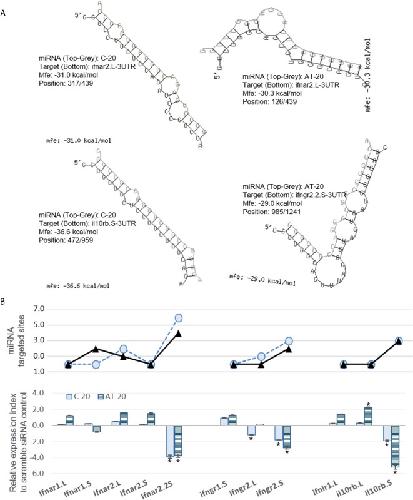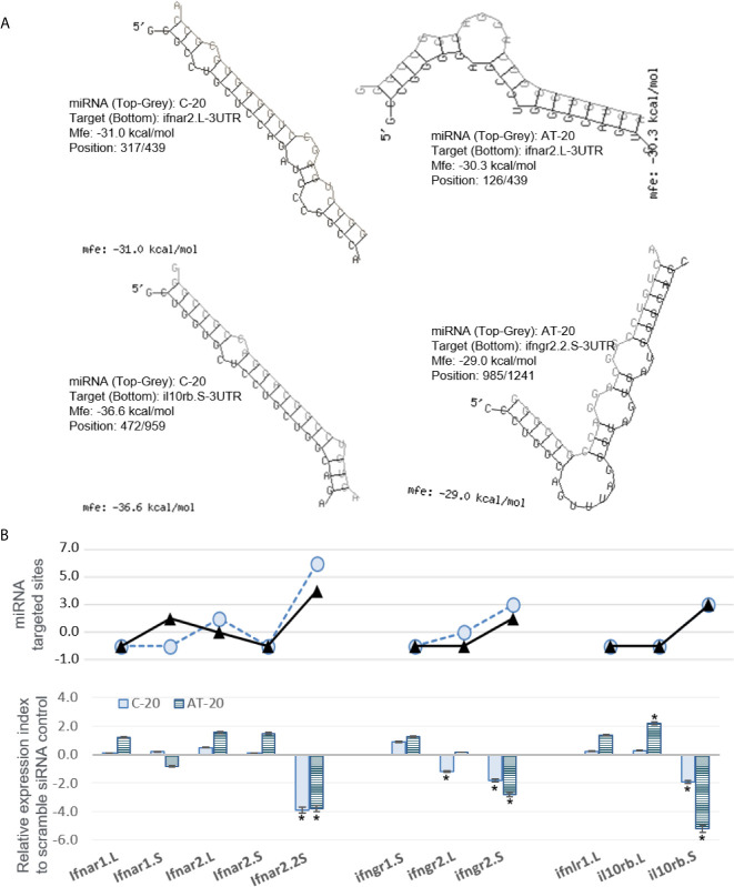 Figure 10. Examples of miRNA that are predictably targeted on 3’-UTR regions of Xenopus mRNA encoding interferon receptor subunits. (A) Hybridization of individual miRNA with its mRNA targets was performed using a program of RNAhybrid with its accompanying programs RNAcalibrate and RNAeffective as described. The hybridization structures and minimum free energy (Mfe) are given, the thresholds of Mfe was set as -28.0 kcal/mol to reflect typical Mfe of miRNA (like let7) hybridization to mRNA targets. MiRNA C-20 or AT-20, the twentieth miRNA in the C or AT groups, respectively, as illustrated in