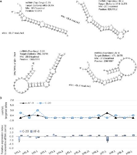 for sequence detail. (B) Schematic shows validation using synthetic siRNA with identical sequences to representative miRNAs. Synthesis of siRNAs and transfection of X. laevis A6 cells were performed as described, and gene specific RT-PCR was used to quantify the expression of target genes. Top panel: Line chart representing numbers of predicted sites targeted by miRNA AF-8 (black triangles) and C-20 (blue cicles) on the 3’-UTR of each template target. Bottom panel: Bar chart of relative gene expression obtained with C-20 (blue histogram) and AF-8 (hachured histogram) miRNAs. The GenBank Accession numbers of the tested transcripts are listed in