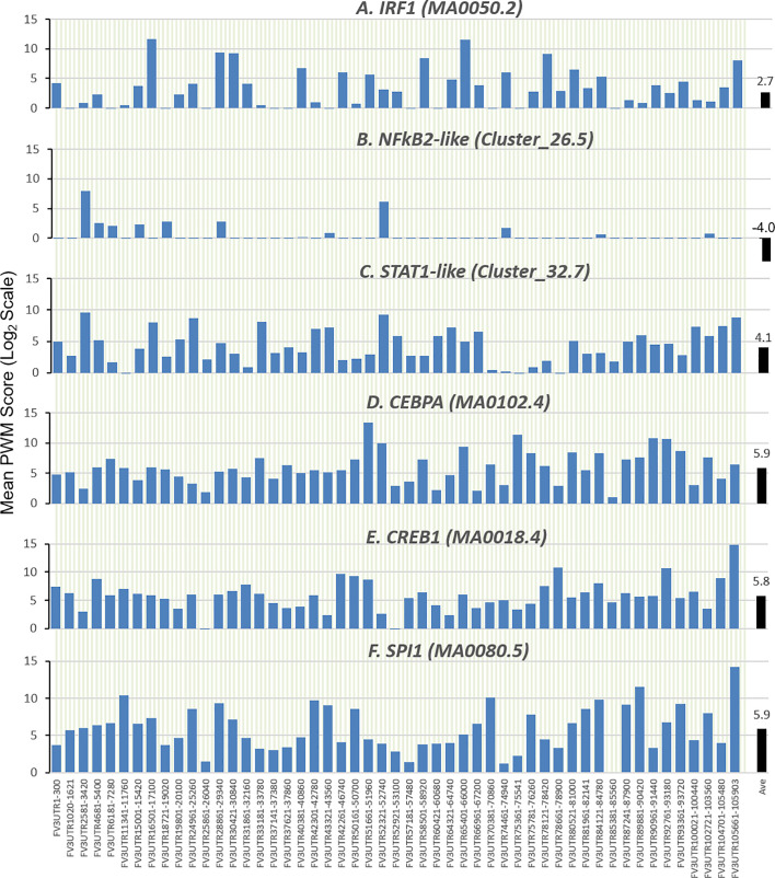 Figure 3. Comparison of position weight matrix (PWM) scores of key cis-regulatory elements (CREs) detected in FV3-genome intergenic regions, and that interact with vertebrate transcription factors potently in immune regulation. Shown are mean PWM scores of CREs in FV3 intergenic regions that were significantly detected to bind (A) IRF-like, (B) NF-κB2-like, (C) STAT1-like, (D) CEBP-like, (E) CREB-like, and (F) PU.1 (a.k.a. SPI1) transcription factors. Mean PWM scores were calculated using tools at https://ccg.epfl.ch/pwmtools/pwmscore.php with CRE Matrices (indicated by Matrix or Cluster numbers, and schematics in