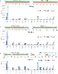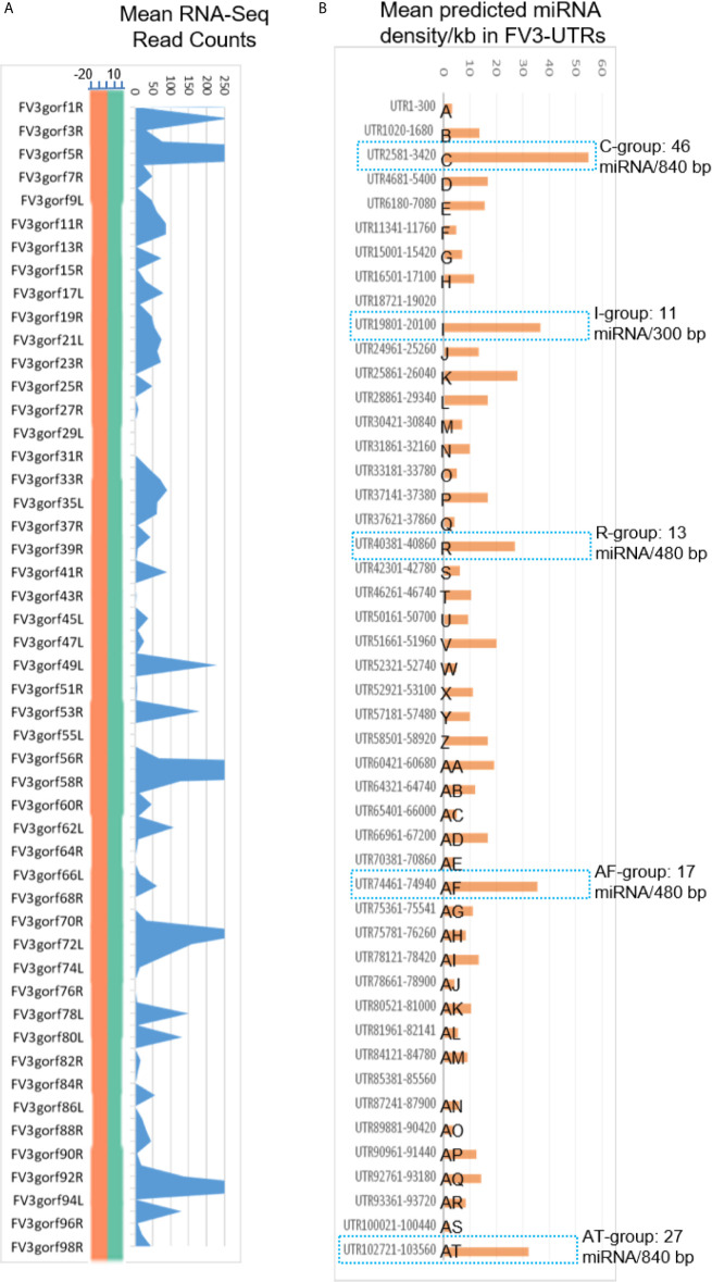 , mean RNA-Seq reads are differentially distributed among intergenic regions and almost all annotated FV3 coding ORFs. A distribution plot between the vertical Axis and gene labels, shows the median of read density (Log2 Unit) of mapped reads along the FV3 genome as in the FV3-Δ64R-infected kidney to show the full-genome coverage at both positive (green) and negative (orange) strand orientations. Transcription of the intergenic regions along the higher read density spanning the ORF coding genes is shown using the shaded blue curve indicating mean read counts across the eight infected tissues tested. (B) The prediction of miRNA-like sequences in most intergenic regions (marked as UTR start-end site along FV3 reference genome including the 5’- and 3’-untranslated regions), which are especially enriched in five regions (named as C, I, R, AF and AT per putative miRNA density/Kb) as marked using blue dash line. The sequence information of all predicted miRNAs is listed in