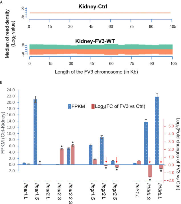 Figure 7. Transcriptomic analysis of the viral genome and X. laevis mRNA encoding interferon receptor subunits in the control (Ctrl) and FV3-infected kidney. (A) The virus-targeted transcriptome analysis shown as a distribution plot of mapped reads in FV3 genome (GenBank Accession No. NC_005946.1). The X-axis shows the length of the genome (in Mb, 0.105 Mb of FV3), and the Y-axis indicates the log2 of the median of read density. Green and red indicate the positive and negative strands, respectively. Note, no FV3 transcript read was obtained from the control (Ctrl) mock-infected kidney, and the full coverages of both positive and negative reads on the FV3 genome in the infected kidney. (B) Family-wide transcriptomic analysis of X. laevis mRNA encoding interferon receptor subunits for type I (ifnar1/2), II (ifngr1/2), and III (ifnlr1/il10rb) IFNs to show the differential expression of these IFN receptor genes in the kidney (Blue bars against the left Axis for FPKM, Fragments Per Kilobase of transcript per Million mapped reads) and regulated expression in FV3-infected kidney (Orange bars against the right Axis for Log2 fold changes). Note the significant reduction of the beta-subunits of type II and type III IFN receptors (indicated by red arrows), which may putatively result from a higher enrichment of the intergenic miRNA species as shown in