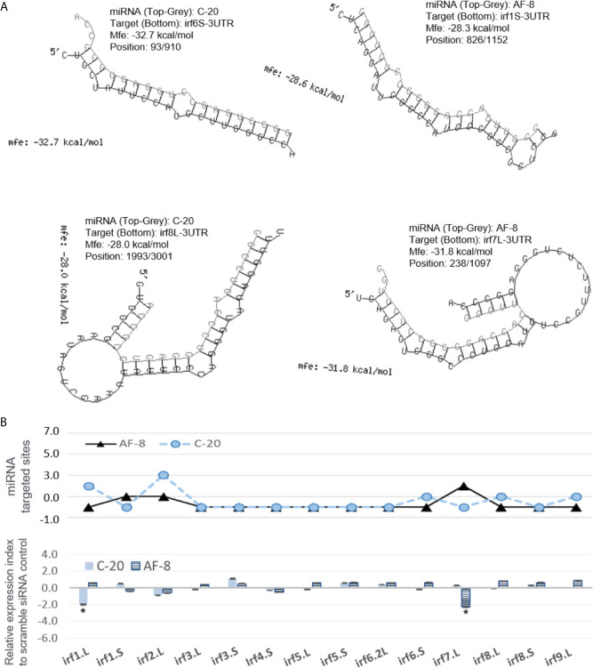 Figure 11. Examples of miRNA that are predictably targeted on 3’-UTR regions of X. laevis mRNA encoding several IRF genes. (A) Hybridization of individual miRNA with its mRNA targets was performed using a program of RNAhybrid with its accompanying programs RNAcalibrate and RNAeffective as described. The hybridization structures and minimum free energy (Mfe) are given, the thresholds of Mfe was set as -28.0 kcal/mol to reflect typical Mfe of miRNA (like let7) hybridization to mRNA targets. MiRNA C-20 and AF-8, the twentieth and eighth miRNA in the C and AF group, respectively, as illustrated in