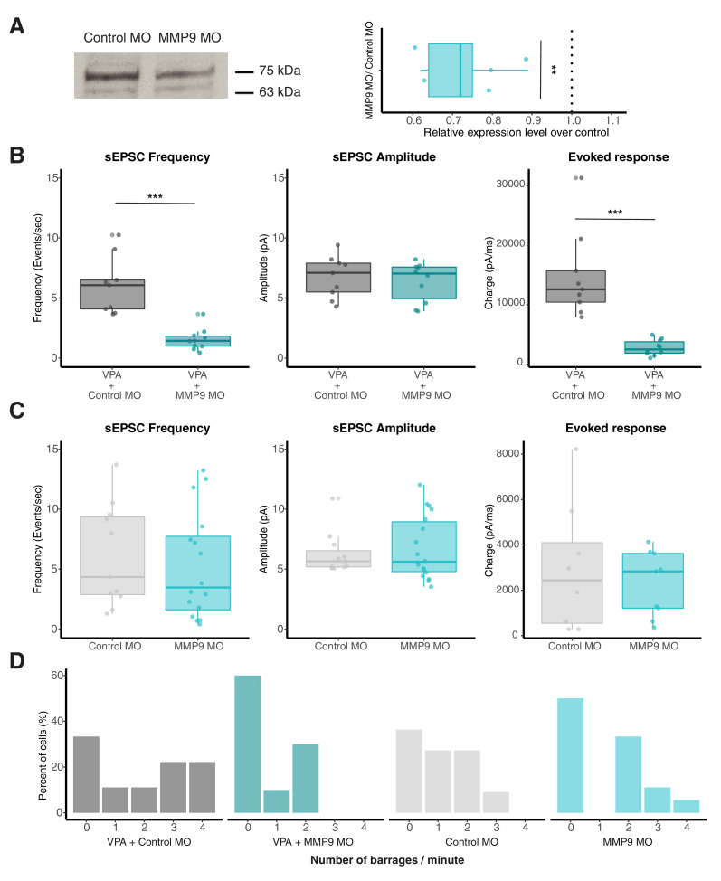 Figure 3. Morpholino targeted against MMP-9 rescues VPA-induced effects.(A) Western blot image (left) indicating MMP-9 levels (75kD band) in control (scrambled) MO and MMP-9 MO transfected groups. Boxplot (right) shows relative MMP-9 levels for control MO and MMP MO transfected tadpoles. MMP-9 MO group consistently shows relatively reduced MMP-9 levels compared to controls. The dotted line represents a ratio of 1 (no difference). The 63 kDa band is a non-specific band labeled by MMP-9 antibody that shows no change. (B) Boxplots showing sEPSC frequency, amplitude and evoked synaptic response from VPA + Control MO and VPA + MMP-9 MO groups. Frequency of sEPSCs and not amplitude are significantly enhanced in VPA + Control MO group. Total charge from evoked synaptic response is significantly higher in the VPA + Control MO compared to VPA + MMP-9 MO-treated animals. Data are represented as median ± IQR. (C) Boxplots showing sEPSC frequency, amplitude and evoked synaptic response from Control MO and MMP-9 MO alone. Control MO and MMP-9 MO alone does not differ significantly in sEPSC frequency or amplitude. MMP-9 MO alone does not show any significant effect on evoked response. Data are represented as median ± IQR. (D) Histogram showing relative barrage frequency for each group. Higher number of barrages are observed for VPA + control MO, and this effect is rescued by addition of MMP-9 MO. ** p < 0.005, *** p < 0.0001. Figure 3—source data 1. Morpholino source data. |