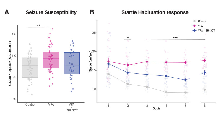 Figure 4. Inhibition of MMP-9 reverses VPA-induced behavioral effects.(A) Boxplots showing seizure frequencies for Control, VPA and VPA + SB-3CT groups. Seizure frequency is increased in the VPA group, but this effect is rescued by addition of SB-3CT. Data are represented as median ± IQR. (B) Line plot for startle response habituation for Control, VPA, and VPA + SB-3CT. VPA-treated animals show less habituation to startle response compared to control animals. Addition of SB-3CT to VPA reverses this effect. Bouts 1 to 5 are separated by 5 min time intervals, whereas bout six is separated from bout 5 by a 15-min time interval. Each dot represents average with standard error bars. * p < 0.05, ** p < 0.005, *** p<0.001. Figure 4—source data 1. Behavior data. |