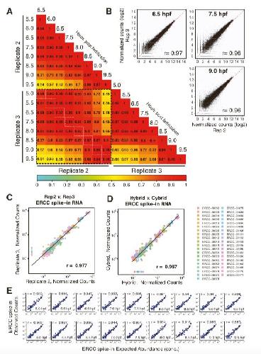 Figure S1. RNA-seq time series, replicate, and exogenous spike-in RNA quality assessment. Related to Figure 1 and Figure 2. (A) Correlation matrix for replicates 2 and 3 at similar time points in hybrids. Pearson correlation for gene expression values is shown in each box. Color corresponds to Pearson correlation value as indicated in the legend below. To reduce zero-inflated correlation effects, we only considered a gene if it had >40 counts total across the time series in both replicates (mean expression >2.5 counts per time point). White dashed boxes correspond to most highly similar time points between replicates. (B) Scatterplot of gene expression values for all genes in hybrids for 2 replicates indicates high reproducibility. Time points shown include 6.5 hours post fertilization (hpf), 7.5 hpf, and 9.0 hpf. X- and Y-axes show log2(counts) of spike-in normalized RNA-seq gene counts. Dashed diagonal line is X=Y. Pearson correlation shown in inset of each plot. (C) Scatterplot of ERCC (External RNA Controls Consortium) spike-in RNA from two hybrid replicates at all time points shows high reproducibility for each of 38 unique spike-in RNA species used during normalization, as well as the spike-in population. Spike-in RNAs were used to normalize expression counts from all time points and conditions within each replicate (see STAR methods). Each color represents a spike-in RNA species, and each RNA includes the 8 high-quality time points found in both replicates. Black line denotes the linear fit to the data. X- and Y-axes show spike-in normalized RNA-seq counts. ERCC RNAs along the Y-axis (7/38) had low expression in one time point in one replicate that had lower sequencing read depth. Pearson correlation shown in lower right corner (r = 0.977). (D) Scatterplot of ERCC spike-in RNA from the hybrid (high ploidy) and cybrid (low ploidy) conditions reveals consistent expression in both conditions at all time points. Hybrid and Cybrid data are from matched samples from a single egg clutch. Each of 38 unique spike-in RNAs are represented by a single color. Black line denotes the linear fit to the data. Pearson correlation shown in lower right corner (r = 0.97). (E) Scatterplot of observed spike-in RNA counts and their expected abundance based on their known concentrations upon addition to samples. High correlations are present for all time points in both hybrids and cybrids shown for one replicate. Similar correlations were found for the second replicate (data not shown). Each blue dot represents one unique spike- in species. Black line denotes the linear fit to the data. Pearson correlation shown in upper left of each plot. |