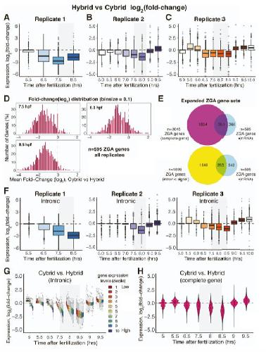 Figure S4. Zygotically activated genes are delayed in embryos with less DNA. Related to Figure 3. (A) Distribution of fold-changes for each ZGA gene’s expression in cybrid relative to hybrid embryos in the replicate 1 time series. Hybrid embryos are the reference, so a decreased fold-change indicates decreased expression in cybrids. For each time point, fold-changes shown are the means of log2-normalized fold-change for all genes from replicate 1. In (A-C), the box shows the mean and 1st and 3rd quartiles. In (A-C) the gray shaded box denotes timing of the MBT. N=595 genes. (B) Distribution of fold-changes for each ZGA gene’s expression in the replicate 2 time series. Fold-changes are means of log2-normalized fold-change for all genes in replicate 2 as in (A). (C) Distribution of fold-changes for each ZGA gene’s expression in the replicate 2 time series. Fold-changes are the means of log2-normalized fold-change for all genes from replicate 3 as in (A). (D) Histograms of fold-changes for defined ZGA genes in all 3 replicates at time points across the MBT (7.5 hpf, top; 8.0 hpf, middle, 8.5 hpf, bottom). Hybrid embryos are the reference; a decreased fold-change indicates decreased expression in cybrids. For each time point, fold-changes are means of each ZGA gene’s log2-normalized fold-change across 3 replicates (for time points 7.5 hpf and 8.5 hpf) or 2 replicates (for 8.0 hpf). (E) Venn diagram shows overlap between our mRNA X. tropicalis ZGA gene set analyzed in the main figures (light blue, N=595) and expanded X. tropicalis ZGA gene sets derived from total gene signal (purple, N=2045) or intronic signal (yellow, N=1899). The total number of unique defined ZGA genes between the total gene signal set and the mRNA set is N=2289 (2045+244). (F) Distribution of fold-changes for intron-derived ZGA gene expression in cybrid relative to hybrid embryos in all three replicate time-series. Fold-change, boxplot parameters, and gray shading are as described in (A-C) (N=1899 genes). (G) Distribution of log2-normalized fold-changes of each intron-derived ZGA gene’s expression in cybrid vs hybrid embryos. Genes are binned according to expression level deciles. Expression level is each gene’s mean level across all time points. Highest expression decile in purple, lowest in dark red (N=1899 genes). (H) Violin plot displaying the distribution of fold-changes for each ZGA gene’s expression in cybrid relative to hybrid embryos, using expression counts across the full gene length. Box inside shows mean and 1st and 3rd quartiles. Hybrid embryos are the reference so a decreased fold-change indicates decreased expression in cybrids. Fold-changes are population means of every ZGA gene’s log2-normalized fold-change mean from 3 replicates. Each time point contains 2 or 3 replicates (N=2045). |
