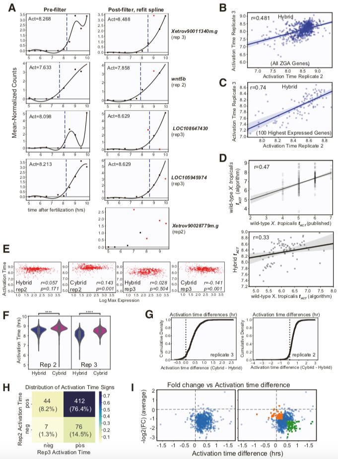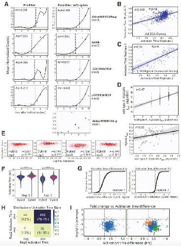 Figure 4. Decreased DNA per cell leads to delayed ZGA gene activation (A) Smoothing spline fit (black line) of hybrid embryo RNA-seq time series for example ZGA gene. Black dots denote mean-normalized expression values at each time point. Blue dashed line denotes the estimated âactivation point.â One replicate is shown as representative. Schematic below displays activation time approach to compare transcriptomic time series data. (B) Curve fit and estimated activation times for example ZGA genes in hybrid and cybrid embryos. Time difference between dashed lines (cybrid â hybrid) = activation time difference or ÎtAct. One replicate is shown as representative. (C) Violin plot of mean activation time for each gene over two replicates in hybrids and cybrids. Boxplot in center shows median and 1st and 3rd quartiles. ââââp << 10â10 (paired sample t test w/Bonferroni correction; N = 547). (D) Cumulative distribution of the activation time difference (h) between cybrids and hybrids (N = 547). (E) Relationship between ÎAct and maximum expression for each gene. Values were binned and smoothed over a 30-min sliding window. Light blue is standard error. Replicate 3 is shown as representative. |