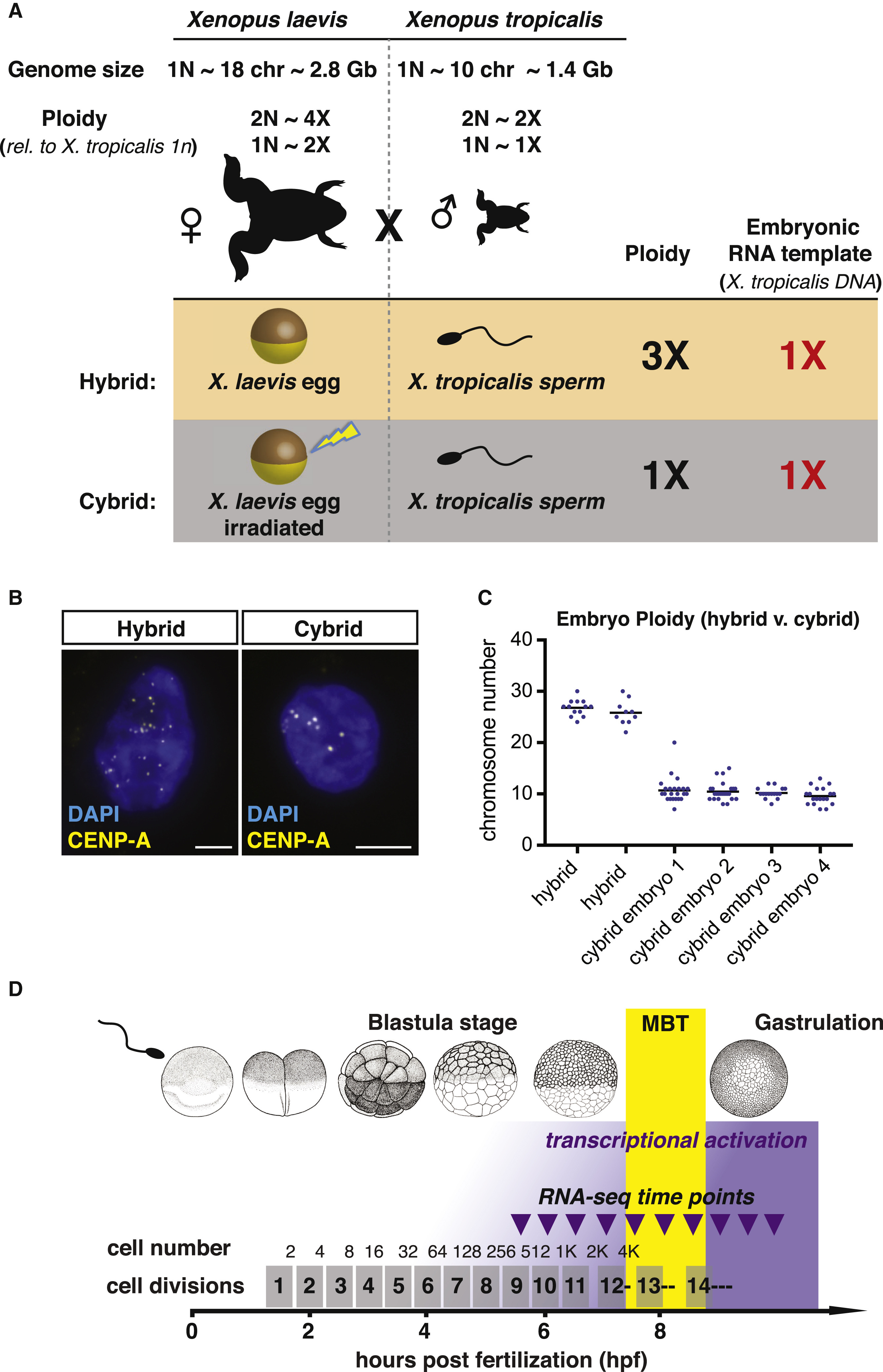 Figure 1. Xenopus hybrid and cybrid embryos have a 3-fold difference in DNA per cell (A) Experiment schematic. Xenopus laevis has â¼2à more DNA than Xenopus tropicalis. X. laevis eggs fertilized with X. tropicalis sperm generate hybrid embryos. UV irradiation destroys the genome in X. laevis eggs so that fertilization results in cybrid (cytoplasmic hybrid) embryos containing 3-fold less DNA per cell than hybrids. The X. laevis maternal environment and X. tropicalis genome template for RNA expression are identical in both conditions. (B) Representative interphase nuclei from hybrid and cybrid embryos, stained to visualize DNA (DAPI) and centromeres (antibodies against CENP-A). The interphase centromere number equals the chromosome number. Scale bar represents 5 μm. (C) Graph of chromosome counts in hybrid and cybrid. Each point represents one nucleus, and each cluster is a different embryo. The chromosome number decreases from â¼28 in hybrids to â¼10 in cybrids. The nucleus with 20 chromosomes in cybrid-embryo-1 was in mitosis with the expected double X. tropicalis chromosome complement. (D) Schematic depicting the developmental timeline of early Xenopus embryo development. Gray rectangles, cleavage cell division. The MBT (yellow) occurs at the â¼12th cell division (4,000-cell stage), corresponding to Nieuwkoop and Faber (NF) morphological stage 8.5. Dashed lines after divisions 12â14 indicate loss of cell division synchrony. Purple triangles indicate embryo collection time for the transcriptomic time series. |