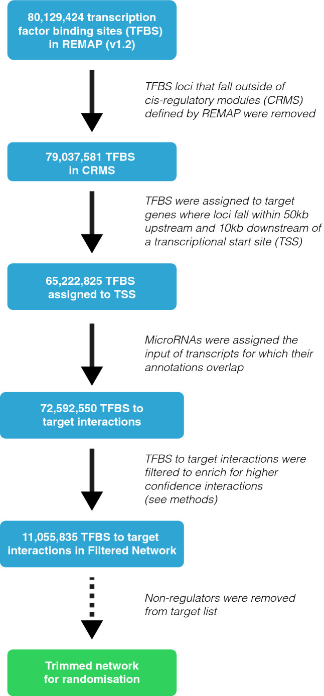 Figure 1. Refinement of TFBS data to final network. The original REMAP (v1.2) data contain 80,129,424 TFBS. These data were first filtered to keep only those found in CRMs (regions where TFBS were found to overlap). These peaks were then assigned to TSS of all genes as annotated in Ensembl 89 in a window of 50 kb upstream of the TSS and 10 kb downstream of the TSS (see “Methods”). To increase the confidence in the interactions between TFs and target genes, TSS-TF interactions were filtered based on the mean binding profiles of each TF. Interactions ≥ mean binding were maintained. This filtering produces the final network. As all interactions in which we are interested contain feedback, we produced a trimmed network that only contains genes which are both targets and regulators.