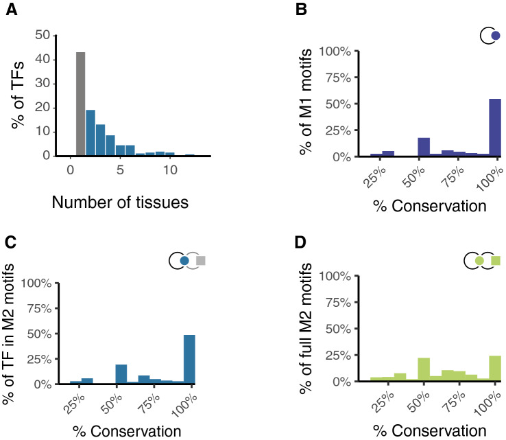 Figure 5. Conservation of TF in motifs between tissues. (A) Percentage of TFs found in multiple tissues. 45% of TFs have data in only one tissue (grey bar). The remaining TFs have TFBS data in 2 or more tissues. (B) Histogram showing the % conservation of M1 motifs between tissues. (C) Histogram showing the % conservation of TFs (circle) in M2 motifs between tissues, showing which transcription factors are in M2 motifs between tissues. (D) Histogram showing the % conservation of full M2 motifs between tissues involving specific combinations of TFs (circle) and microRNA (square) are conserved between tissues.