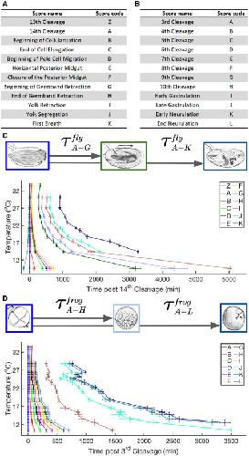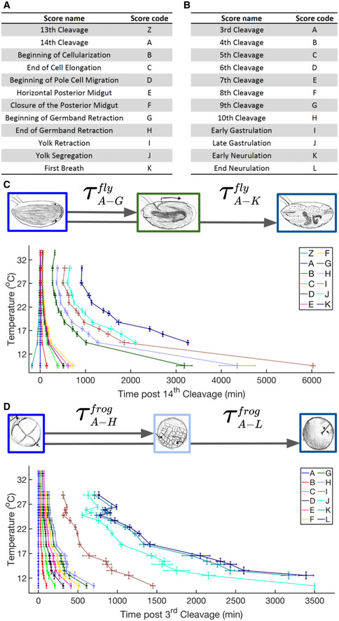 A table representing D. melanogaster developmental scoring event names and sequential score codes used throughout this paper.X. laevis developmental scoring and codes used throughout this paper.Shown here is a schematic depicting how time Ï intervals are determined based on beginning and ending scores. Plotted also are all mean time intervals from t = 0, defined as 14th syncytial cleavage, to reach various developmental scores in D. melanogaster embryos. Error bars in time indicate standard deviation among replicates (n = 2â13 biological replicates per temperature). Error bars in temperature represent the standard error (± 0.5°C) of the thermometer used when recording temperature.As (C) but for X. laevis, since t = 0 (3rd cleavage) at temperatures ranging from 10.3°C to 33.1°C (n = 1â23 biological replicates per temperature).