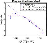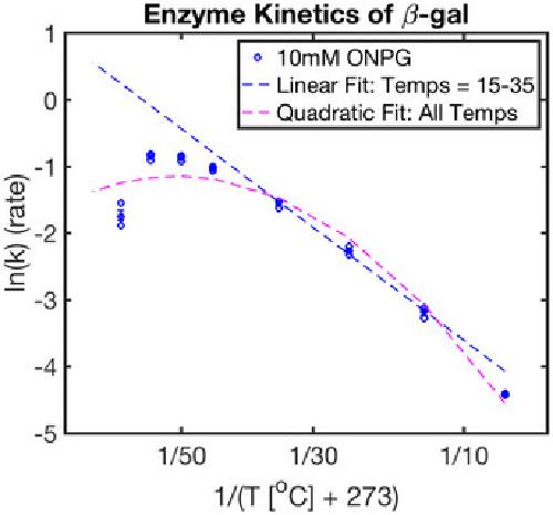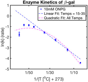 Figure EV5. Assay of β‐galactosidase activity over its viable temperature range under 0‐order kinetic conditionsPlotted here is the Arrhenius plot for this conversion. Replicates (blue circles) are fit with a linear fit (dashed blue line) from 15 to 35°C and a quadratic fit (dashed magenta) over the entire viable temperature range. Standard error is shown as blue error bars (n = 3 technical replicates per temperature). Reaction was run using 0.25 U/ml β‐galactosidase.