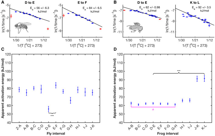 Arrhenius plots for two examples of developmental intervals (D–E, E–F) in D. melanogaster. Blue data points are the means of replicates for viable temperatures that survive until First Breath. Red data represent more extreme temperature values where embryos do not survive until First Breath. A linear regression (solid black line, n = 66, 65 independent biological measurements, respectively) was fit over the core temperature range (14.3–27°C), from which Ea was calculated and reported with its 68% confidence interval. Error bars in temperature represent the standard error (± 0.5°C) of the thermometer used when recording temperature. Error bars in ln(rate) represent standard error (n = 3–13 biological replicates).As (A) but for intervals G‐H, K‐L in X. laevis. Blue data points represent viable temperatures where embryos survive until Late Neurulation. A linear regression (solid black line, n = 120, 94 independent biological measurements, respectively) was fit over core temperatures spanning 12.2–25.7°C, from which the Ea was calculated and reported in black. Error bars in temperature represent the standard error (± 0.5°C) of the thermometer used when recording temperature. Error bars in ln(rate) represent standard error (n = 1–10 biological replicates).Apparent activation energies in fly calculated from Arrhenius plots (Fig EV2A). The x‐axis is labeled with the developmental interval, marked by start and endpoint. Error bars represent the 68% confidence interval for the activation energy based on linear fit in the Arrhenius plot. Black braces connect examples of developmental intervals that show statistically significant differences in slope (and thus Ea), with respectable power (> 0.8), ***P < 0.001, (F‐test), (n = 39–60 independent biological measurements).As (C) but for frog Ea calculated from plots shown in Fig EV2B. Magenta brackets represent groupings (all points above the bracket) showing no statistical difference (#) in activation energy (F‐test), (n = 94–135 independent biological measurements).