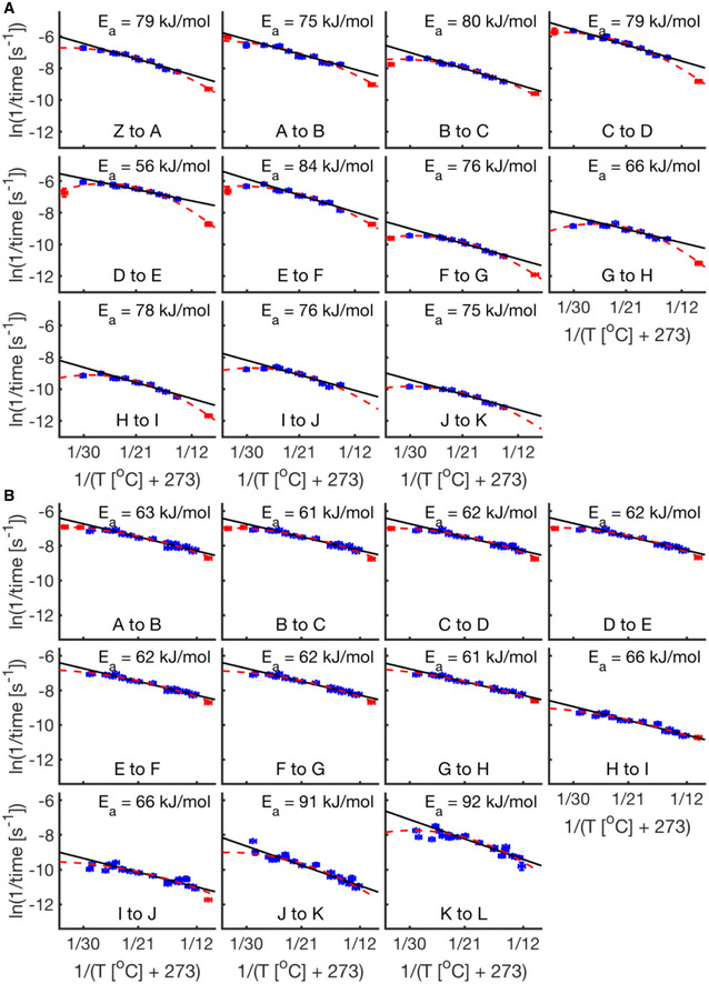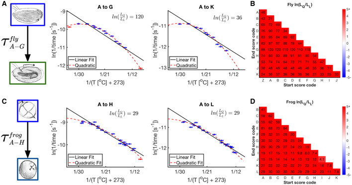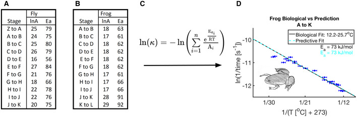 A table showing fly intervals marked by their start and ending scores and their empirically determined prefactors (lnA) and apparent activation energy (Ea) from Fig EV2A.As (A) but for frog prefactors and apparent activation energy calculated empirically from Fig EV2B.Our predictive equation determined in equation (3) for an assumed sequential linear network.Prediction of ln(k) for the composite network (dashed cyan) is overlaid on the empirical data (blue and red error bars) and linear fit (solid black) for this developmental interval (A to K). Also shown are the color‐coded Eas calculated for each fit over the temperature interval 12.2–25.7°C (n = 100 independent biological measurements). Error bars in temperature represent the standard error (± 0.5°C) of the thermometer used when recording temperature. Error bars in ln(rate) represent standard error (n = 2–10 biological replicates per temperature).