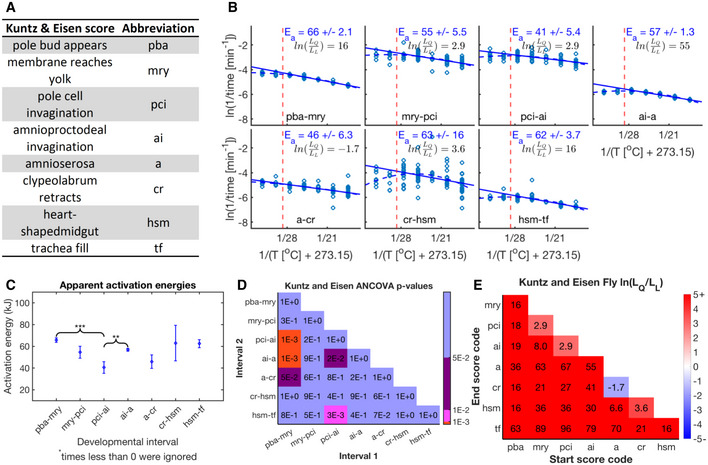Scores Kuntz and Eisen used and abbreviation for the remainder of this figure.Arrhenius plots for durations between adjacent developmental events of Kuntz and Eisen’s data. We fit data for temperatures of 27.5°C and below (dashed red line, i.e., core temperature range) via linear regression (solid blue line). Shown is the apparent activation energy plus/minus the 68% confidence interval. Additionally, we fit the entire temperature range with quadratic (dashed blue line) and linear fits. BIC was also calculated and is shown here as the natural log ratio likelihood for quadratic over linear fit and displayed in black.Apparent activation energies over the core temperature regime are shown. Error bars show the 68% confidence intervals. Black braces point out example developmental intervals that have significantly different apparent activation energies. ‘**’P‐value < 0.01, ‘***’P‐value < 0.001.Shown are P‐values between all developmental intervals. Blue marks P‐values above 5E‐2, purple marks ≤ 5E‐2, pink marks ≤ 1E‐2, and red marks ≤ 1E‐3.Shown are natural log ratio of likelihoods for quadratic over linear fits for all possible developmental intervals, marked by their starting and ending scores, using Kuntz and Eisen’s data over all temperatures. Blue signifies a preference for linearity; red signifies a preference for quadratic behavior.