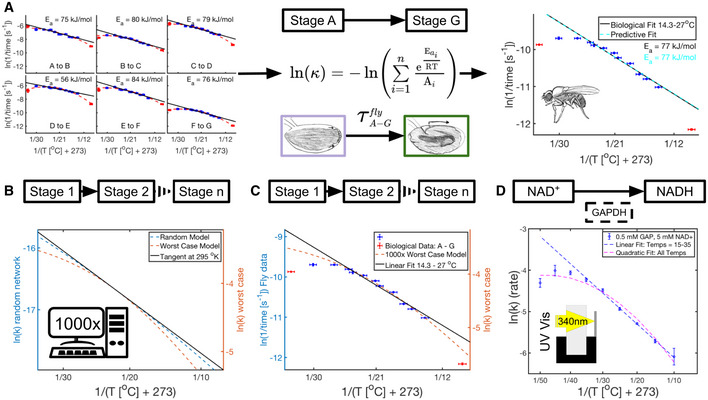 Shown is the methodology used to predict the linear regression for fly development from A to G using empirical parameters from individual intervals and equation (3). Far right, this prediction of ln(k) for the composite network (dashed cyan) is overlaid on the empirical data (blue and red error bars) and linear fit (solid black line) for this developmental interval (AâG). Also shown are the colorâcoded Eas calculated for each fit over the temperature interval 14.3â27°C (n = 60 independent biological measurements). Error bars in temperature represent the standard error (± 0.5°C) of the thermometer used when recording temperature. Error bars in ln(rate) represent standard error (n = 2â12 biological replicates).Shown is a schematic of a multiâreaction network from Stage 1 to Stage n. Comparison of two reaction networks modeling equation (3) with 1,000 coupled reactions, one with randomly selected Ea and A (dashed blue line), the second with Ea and A optimized for maximum curvature at 295°K (dashed orange line). To allow direct comparisons, the yâaxes were scaled to result in overlapping tangents calculated at 295°K (solid black line).As (B), however, the worstâcase model (dashed orange) is compared to biological data (blue and red error bars representing standard error in ln(rate), n = 2â12 biological replicates per temperature) from (A). To allow direct comparisons, the yâaxes were scaled to result in overlapping linear fits over 14.3â27°C (solid black line).Shown is a schematic representing the conversion of NAD+ to NADH via GAPDH catalyzation. GAPDHâs conversion of NAD+ to NADH was monitored with UV/VIS spectroscopy at 340 nm. Plotted here is the Arrhenius plot for this conversion at various temperatures between 5°C and 45°C. Means of technical replicates (blue circles) are fit with a linear fit (dashed blue line) from 15 to 35°C and a quadratic fit (dashed magenta) over the entire temperature range. Standard error is shown as blue error bars (n = 2â4 technical replicates per temperature).