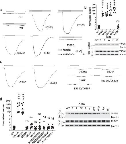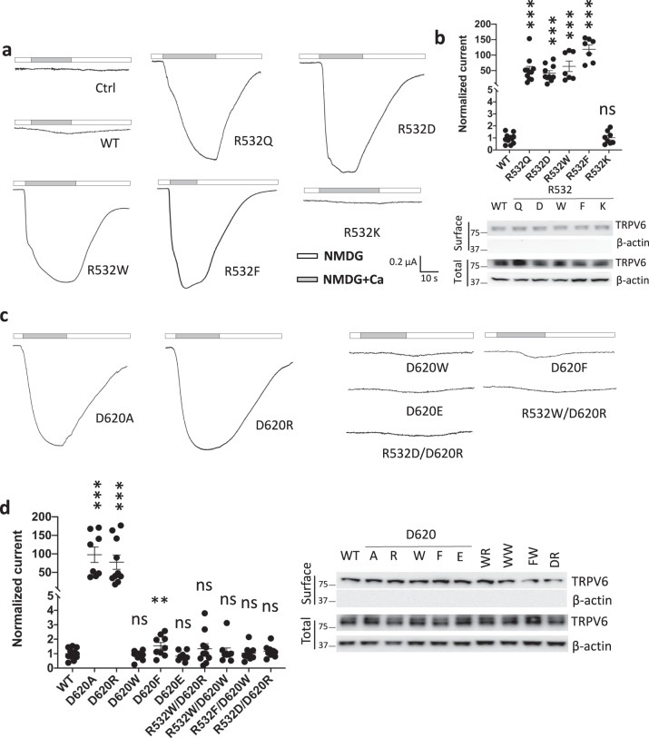 Fig. 1. Functional roles of the TRPV6 residues R532 and D620.a Representative current traces from water-injected (Ctrl) oocytes and those expressing WT TRPV6 or a R532 mutant. b Upper panel: averaged and normalized current values for WT TRPV6 WT or a R532 mutant expressed in oocytes. ***pâ<â0.001; ns not significant. Lower panel: total and surface expression of WT TRPV6 and R532 mutants revealed by biotinylation. β-actin acts as loading control. c Representative current traces from oocytes expressing different TRPV6 mutants. d Left panel: averaged and normalized current values corresponding to WT or mutant TRPV6. Right panel: total and surface expression of WT or mutant TRPV6. **pâ<â0.01; ***pâ<â0.001; ns not significant, from three independent experiments.