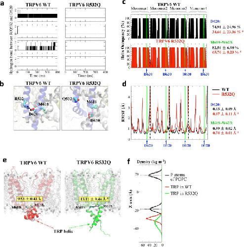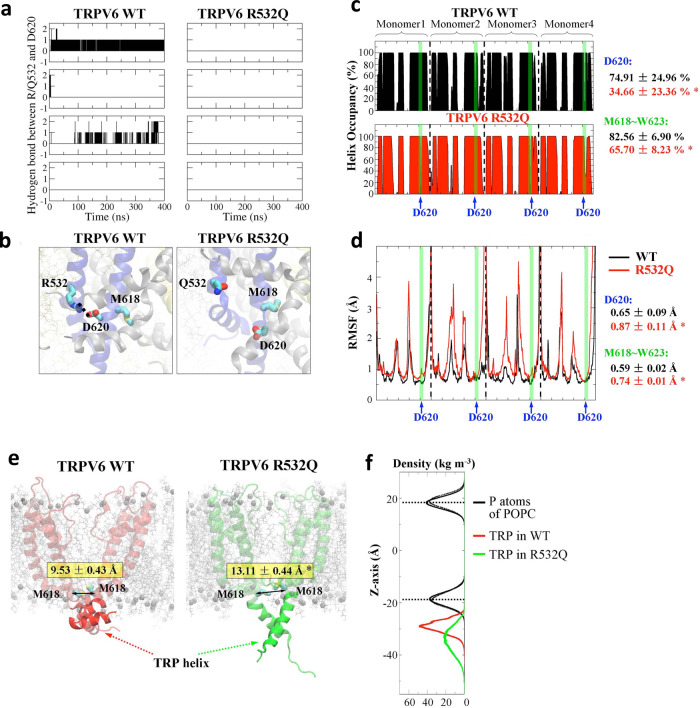 Fig. 3. R532:D620 interaction examined by MD simulation.a Hydrogen bonding between a residue at 532 (R532 or Q532) and D620 as a function of time. b Effect of the R532Q mutation on the D620 conformation. Structural (c) and dynamic (d) changes in D620 and its proximal region (M618âW623). The red and black lines show the RMSD values of TRPV6 with and without the R532Q mutation, respectively, during the 400âns simulations. A higher occupancy value means a more stable secondary structure, while a higher RMSF value indicates higher dynamic flexibility of the residue. e Effect of the R532Q mutation on the distance between the two diagonal M618 in a TRPV6 tetramer. f Effect of the R532Q mutation on the mass density of phosphate (P) atoms in POPC lipid (black curves) and the TRP helix of TRPV6 along the Z-axis. The membrane surface positions are indicated by the density peaks of lipid P atoms (dotted lines). Note: for a display purpose, shown density values of POPC P atoms were reduced by Ã10 from the real values.