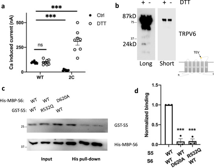 Fig. 2. Associations between R532 and D620 in TRPV6.a Statistical analysis of currents from oocytes expressing TRPV6 or mutant R532C/D620C, with or without 5âμM DTT. ***pâ<â0.001; ns not significant. b Representative WB images with long (long) or short (short) exposure time showing the DTT effect on mutant R532C/D620CTEV. illustration indicating the insertion site of the TEV cleavage. c Representative images on interaction between purified S5 and S6 fragments, without or with an indicated mutation. d Averaged and normalized S5/S6 helix binding, quantified using ImageJ. ***pâ<â0.001, from three independent experiments.