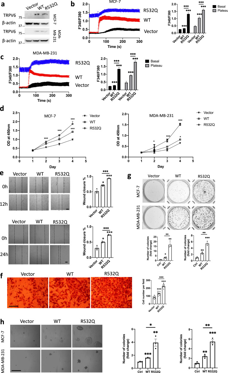 Fig. 4. Effects of the R532Q mutation and TRPV6 channel function on breast cancer cell progression.a Representative expression of TRPV6 and mutant R532Q stably expressed the two cell lines revealed by WB. b Ca imaging experiments in MCF-7 stable cell line. Left panel: cytosolic Ca measured by Fura-2 AM based Ca imaging, before and after application of 2âmM extracellular Ca. Traces are averaged from 15â19 measurements of three independent experiments. Right panel: statistical analysis of averaged basal Ca (0â50âs) and plateau Ca (250â300âs) concentrations. ***pâ<â0.001. c Ca imaging experiments in MDA-MB-231 stable cell line performed under similar conditions as in b. d Cell proliferation assays in MCF-7 and MDA-MB-231 stable cell lines. *pâ<â0.05, ***pâ<â0.001. e In vitro scratch experiments to evaluate cell migration. Representative images and statistical data showing migration of MCF-7 (upper) and MDA-MB-231 (lower) stable cell lines. Scale bar 200âμm. *pâ<â0.05, ***pâ<â0.001. f Representative images and statistical data showing the effect of the R532Q mutation and TRPV6 expression on the colony formation of MCF-7 and MDA-MB-231 stable cell lines. g Representative images and statistical data showing the effect of the R532Q mutation and TRPV6 expression on the invasion of MDA-MB-231 stable cells. Scale bar 100âμm. h Representative images and statistical data on the anchorage-independent colony formation of MCF-7 and MDA-MB-231 stable cell lines in soft agar. Scale bar 200âμm. *pâ<â0.05; **pâ<â0.01; ***pâ<â0.001, from three independent experiments.