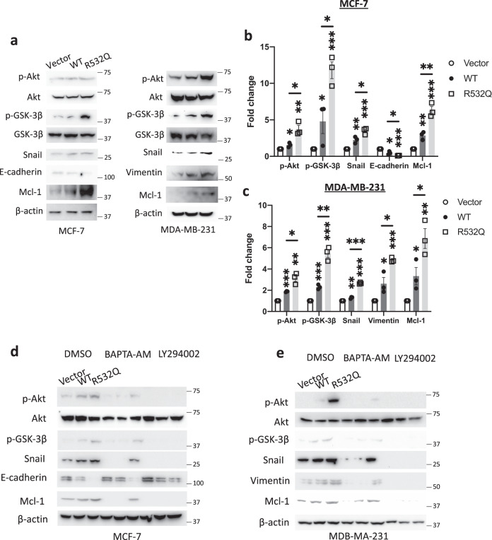 Fig. 5. Involvement of a PI3K/Akt/GSK-3β pathway in and effect of the TRPV6 function on breast cancer development.a Representative WB data showing changes in EMT and antiapoptotic markers in MCF-7 (left) and MDA-MB-231 stable cell lines. Statistical analysis of WB data of the expression of indicated markers in MCF-7 (b) and MDA-MB-231 (c) stable cells. d, e Effects of BAPTA-AM (10âμM, 1âh) and PI3K inhibitor LY294002 (50âμM, 1âh) on the EMT and antiapoptosis markers, with DMSO treatment as control. Shown are representative WB data obtained using MCF-7 (d) and MDA-MB-231 (e) stable cells. *pâ<â0.05; **pâ<â0.01; ***pâ<â0.001, from three independent experiments.