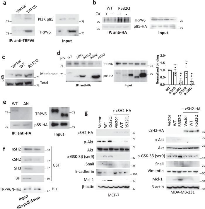 Fig. 6. The TRPV6/p85 interaction and its role in the activation of a PI3K/Akt/GSK-3β pathway by TRPV6 and mutant R532Q in breast cancer cells.a Representative co-IP data showing interaction of TRPV6 with endogenous p85 in MDA-MB-231 cells. b Representative co-IP data showing the effect of mutation R532Q on the interaction of TRPV6 with p85-HA without (1âmM EGTA) or with (0.1âmM) Ca using MDA-MB-231 stable cells. c Effect of mutation R532Q on the total and membrane bound p85 in MDA-MB-231 stable cells. d Interaction of transiently expressed HA-tagged p85 truncation mutants with stably expressed TRPV6 by co-IP in MDA-MB-231 cells. âSH3, ânSH2, âiSH2, and âcSH2 indicate p85 with deletion of SH3 (S2-R93), nSH2 (M322-K430), iSH2 (D434-A614), and cSH2 (L617-Y724), respectively. e Representative co-IP data showing interaction of WT TRPV6 WT and its truncation mutant ÎN (TRPV6 with deletion of the N-terminus, Y328-I725) with p85 in transiently transfected MDA-MB-231 cells. Right panel: Statistical data from three independent experiments showing normalized binding strengths. f Representative in vitro binding data showing binding of purified TRPV6N-His with p85 fragments, as indicated. g Representative WB data showing the blocking peptide effect of transiently expressed cSH2-HAon activation of EMT and antiapoptosis markers by stably expressed TRPV6 and its mutant R532Q in MCF-7 and MDA-MB-231 cells. *pâ<â0.05; ns not significant. All data were from three independent experiments.