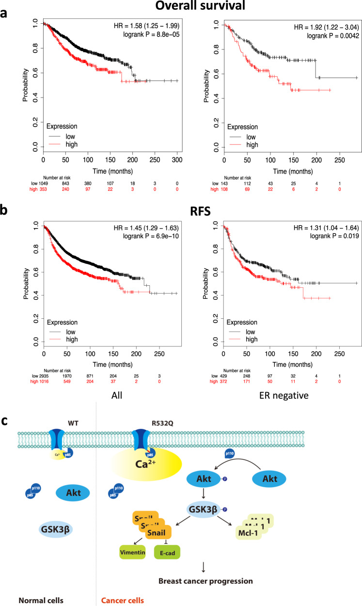 Fig. 7. Correlation between the TRPV6 gene expression and survival in breast cancer patients.Overall (a) and relapse-free survival (RFS). (b) of all types (left) or ERâ (right) breast cancer patients analyzed by KaplanâMeier plots. Hazard ratios (HR) and p values are indicated. c Diagram showing the hypothetical mechanism of how the R532Q promotes breast cancer cell progression through a PI3K/Akt/GSK-3β pathway.